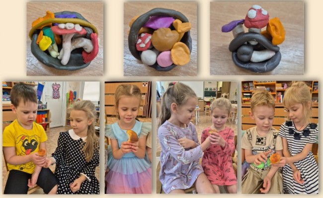 Также наши занятия были посвящены дарам леса: грибам и ягодам. В течение недели мы беседовали о съедобных и ядовитых грибах и ягодах, дети отгадывали загадки, лепили корзинки с грибами, в аппликации создавали лесную полянку. Ребята позвали в гости наших младших друзей из группы «Колобок» и показали им сказку В. Сутеева «Под грибом», малыши остались в восторге.