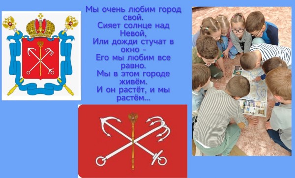 Занятие по петербургуведению было посвящено символом нашего города. Дети вспомнили название города, рассмотрели карту, послушали стихи о городе. Ребята рассмотрели герб и флаг города, выяснили, что на них изображено и почему, чем они отличаются, разучили стихотворение: