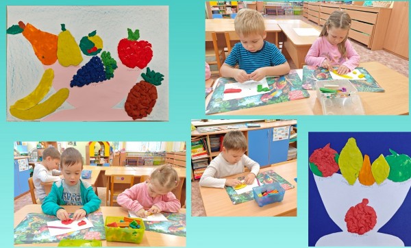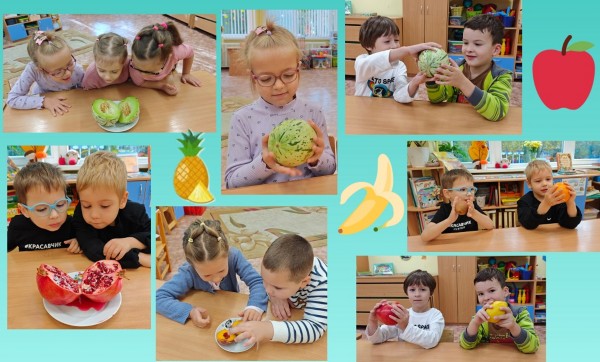 С 22 по 26 сентября у нас проходили занятия по теме «Фрукты». Ребята рассматривали фрукты, сравнивали их, составляли загадки и описательные рассказы о фруктах. Дети лепили и делали аппликацию «Натюрморт», играли в дидактические игры: «Угадай на вкус», выкладывали этапы роста фруктовых деревьев. Прослушали сказки Сутеева: «Яблоко», «Мешок яблок», посмотрели их и разыграли в театрализации. Разучили пальчиковую гимнастику «Фруктовая ладошка»: