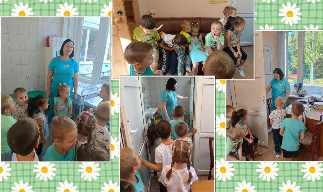 А в медицинском кабинете, Наталья Николаевна, показала ребятам аптечку, охладительные элементы, которые прикладывают к ушибу. Ребята увидели специальные измерительные приборы: ростомер и весы. Мы обсудили, зачем в медицинском кабинете нужна «кровать». Вспомнили, чем можно обработать ранку.