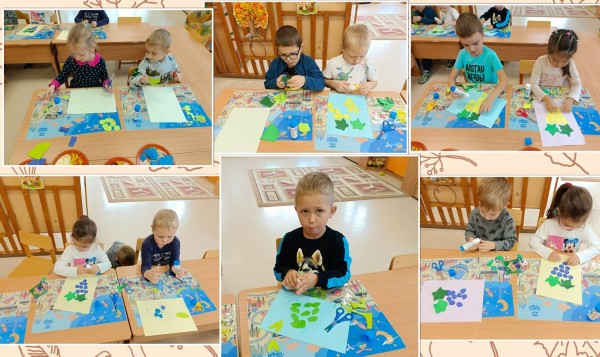 В группе, ребята трудились над подвесами в виде осенних деревьев. Совместно создавали коллективную работу на осеннюю тематику.